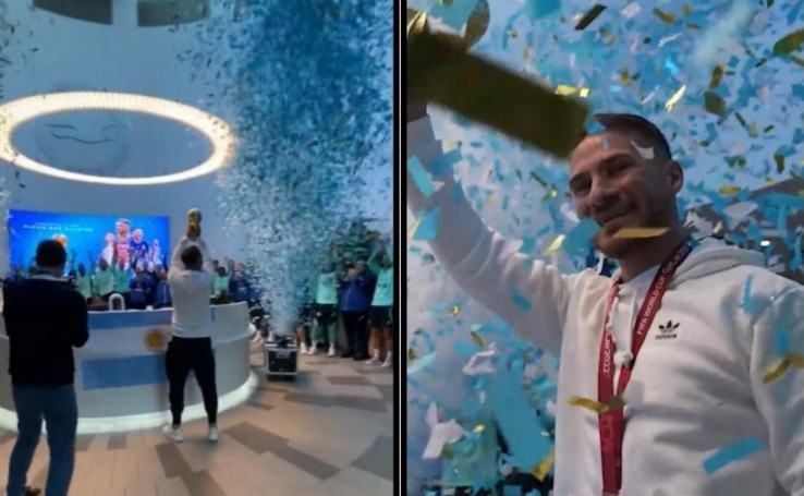 Con banderas argentinas y una gigantografía proyectada sobre una de las paredes, el staff del Brighton recibió al futbolista pampeano, que se abrazó afectuosamente con cada uno de los presentes.