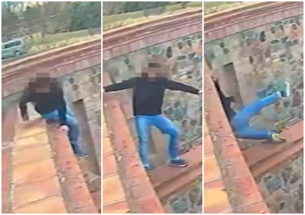 Cuando trata de apoyar las piernas, el hombre se resbala, pierde el equilibrio y termina precipitando de espalda, desde poco menos de dos metros de altura, se observa en el video.