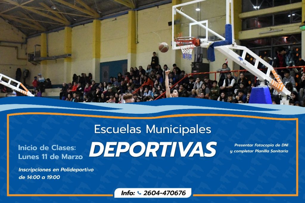 Este lunes 11 de marzo comenzarán las tan esperadas Escuelas Deportivas Municipales, destinadas a niños y adultos de nuestra ciudad que quieran iniciarse o continuar con la práctica de su deporte preferido. Las inscripciones ya se encuentran abiertas, son completamente gratuitas y los interesados deben dirigirse al Polideportivo para anotarse, de lunes a viernes, en horario de 14 a 19 hs. Se debe presentar fotocopia de DNI y llenar la planilla sanitaria.