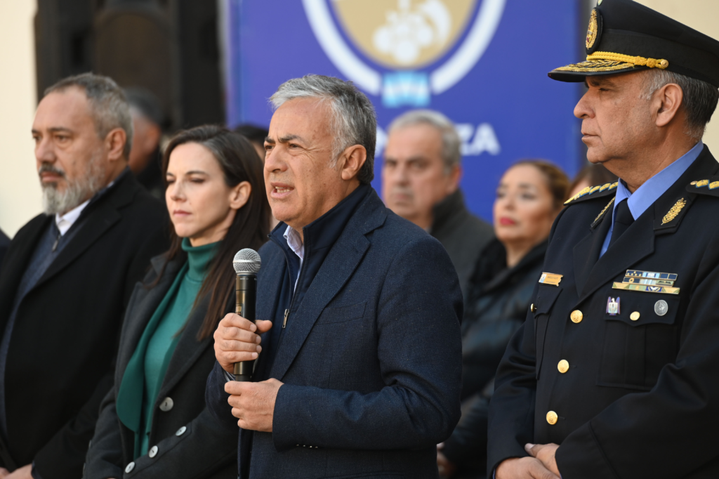 Dirigiéndose a los efectivos policiales, les dijo: “Ustedes saben que todavía en nuestra Constitución figura que el Gobernador de la Provincia es el jefe de las milicias, y si bien es un término viejo, está de más de 100 años, está vigente en la actualidad y la Policía de Mendoza son nuestras milicias”.