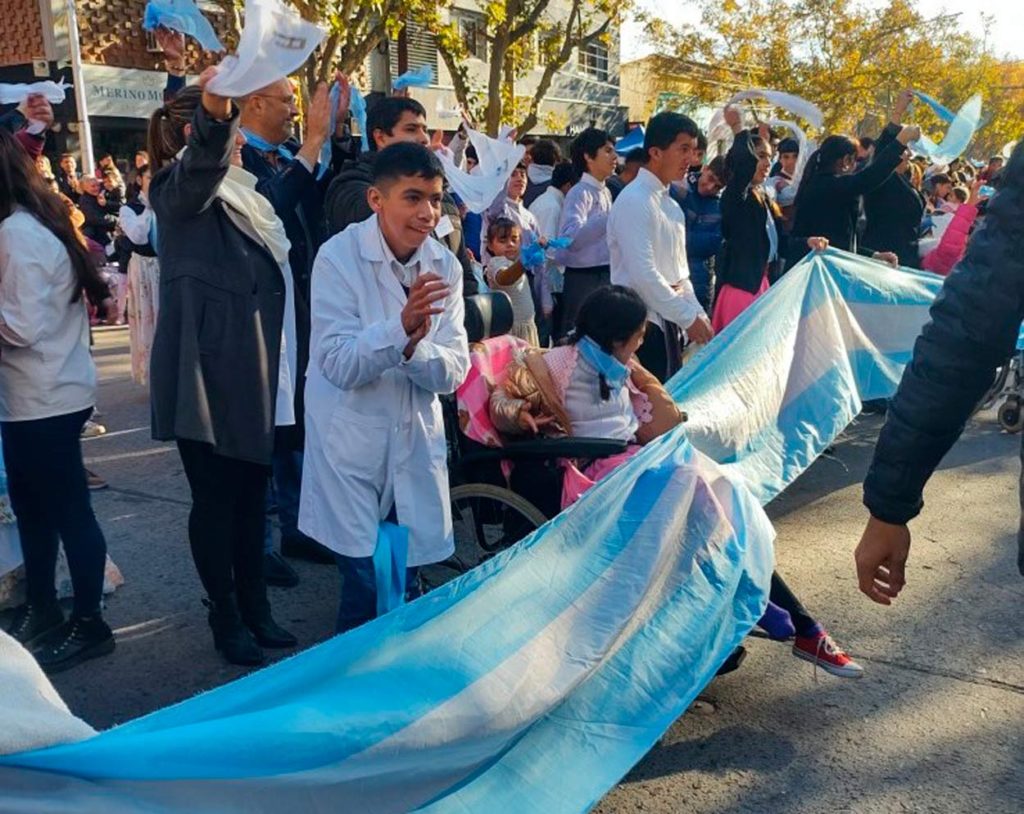 El acto se realizó en la intersección de la Avenida San Martín y calle Francia, y con una gran bandera celeste y blanca desplegada por los alumnos de la escuela, celebraron un nuevo aniversario de la Revolución de Mayo.