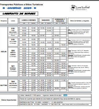 El Laberinto de Borges: Este atractivo turístico es un homenaje al escritor Jorge Luis Borges y se encuentra en San Rafael. Los servicios de transporte público suelen incluirlo en sus recorridos turísticos, permitiendo a los visitantes explorar este singular laberinto (Welcome Argentina).