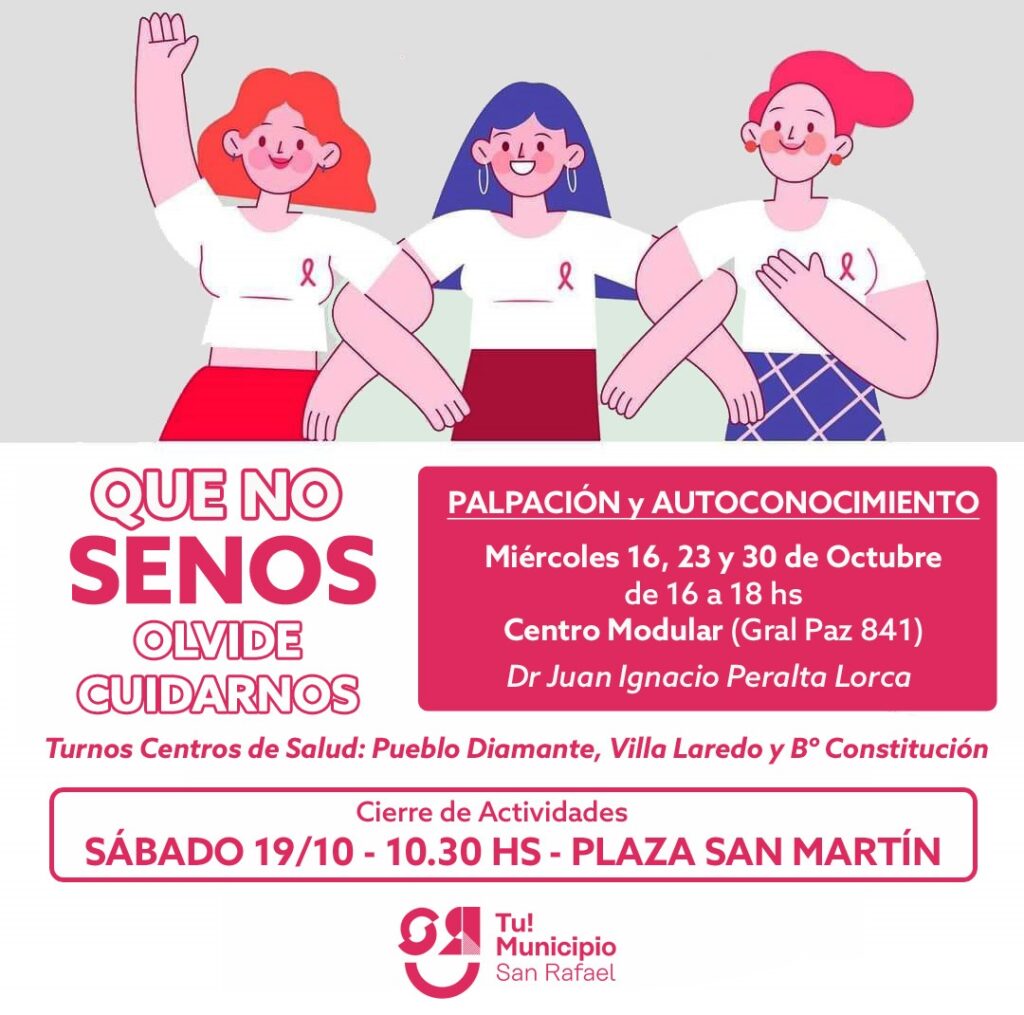 San Rafael se ha unido a la campaña nacional “Octubre Rosa”, una iniciativa dedicada a promover la concientización y prevención del cáncer de mama. A lo largo de este mes, se organizan actividades en todo el país con el fin de difundir la importancia de los controles médicos tempranos y el autoconocimiento corporal, claves para detectar a tiempo esta enfermedad.
