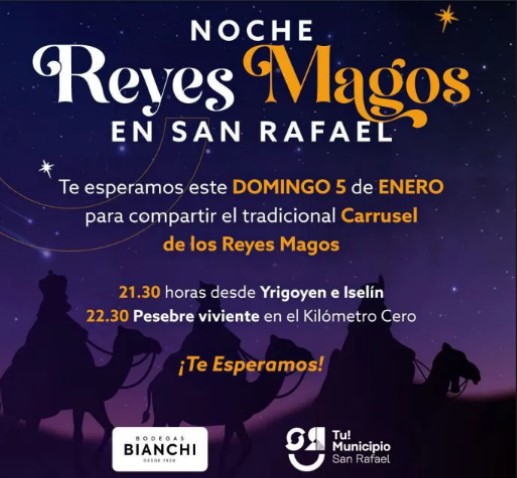 El evento, organizado con el apoyo de Bodegas Bianchi y el Municipio de San Rafael, dará inicio a las 21:30 en la intersección de las avenidas Yrigoyen e Iselín. Los Reyes Magos avanzarán en un carro especialmente diseñado por el artista Sergio Juárez, construido con maestría por personal de la bodega, y se desplazarán por la avenida Yrigoyen hasta llegar al kilómetro cero.