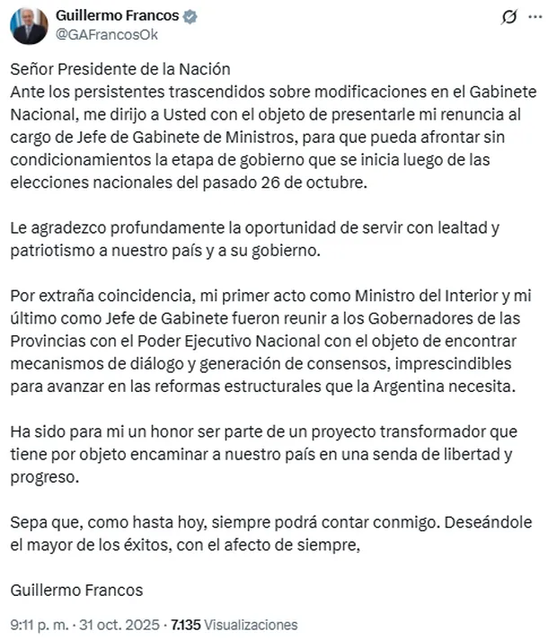 “La Oficina del Presidente informa que el presidente Javier G. Milei le ha aceptado la renuncia al Dr. Guillermo Francos como jefe de Gabinete de ministros”, comienza indicando el escrito que también se lanzó en redes sociales.