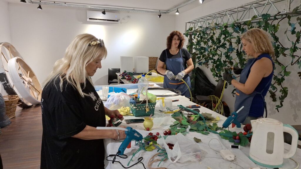 La utilería también se encuentra trabajando día a día en la puesta en escena vendimial. “Venimos trabajando hace semanas en la fiesta”, expresó la encargada Mónica López entre flores, vides y distintos elementos que hacen al universo visual de la fiesta.