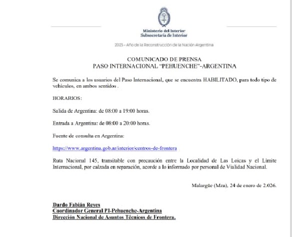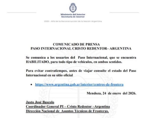 El Paso Internacional Los Libertadores, que conecta Argentina y Chile a través de la Ruta Nacional N° 7, se encuentra abierto este sábado 24 de enero las 24 horas, en ambos sentidos y para todo tipo de vehículos, según informaron desde la Coordinación Argentina.
